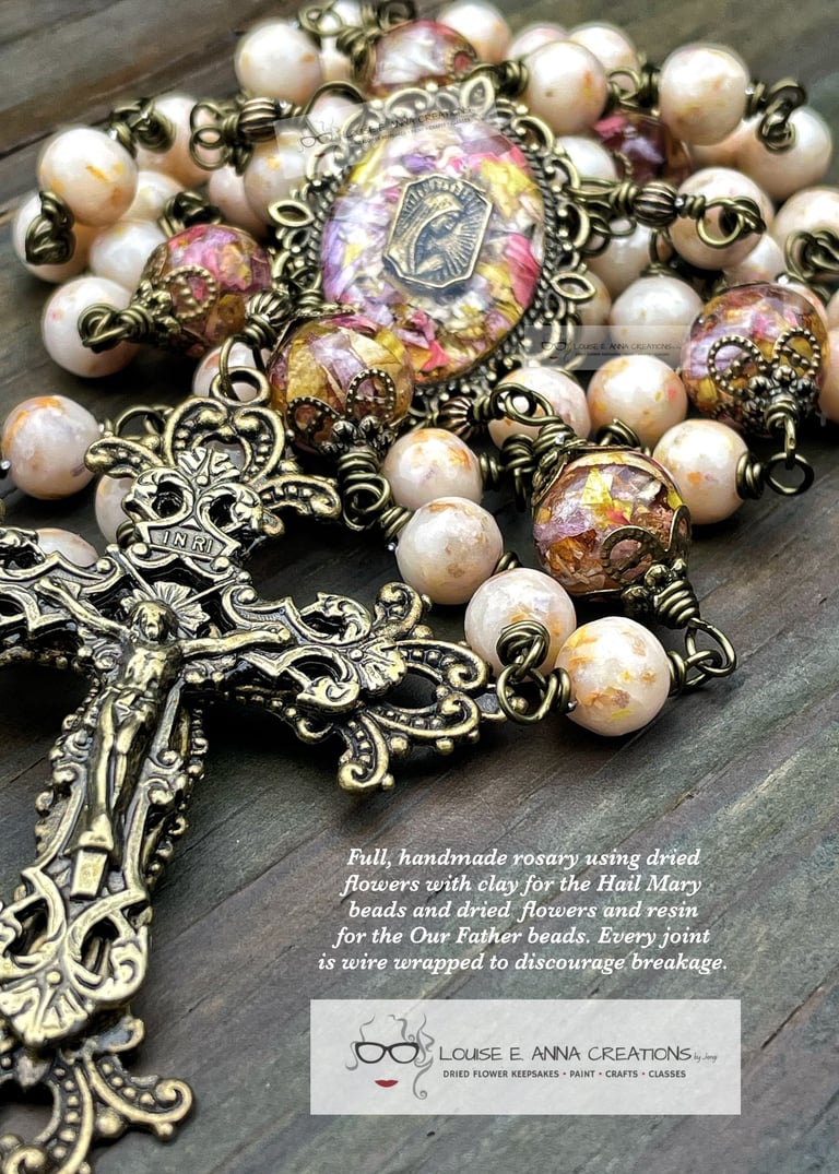 Full, one-decade, or pocket rosaries either with standard Our Father beads or dried flower and resin ones