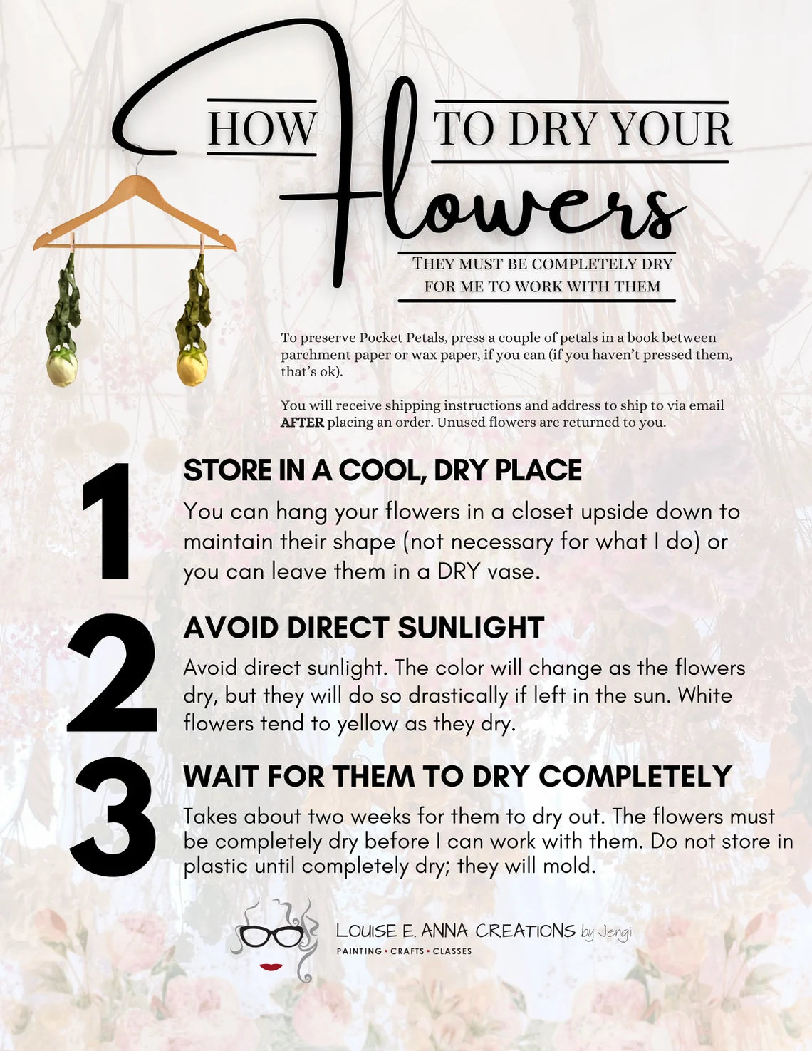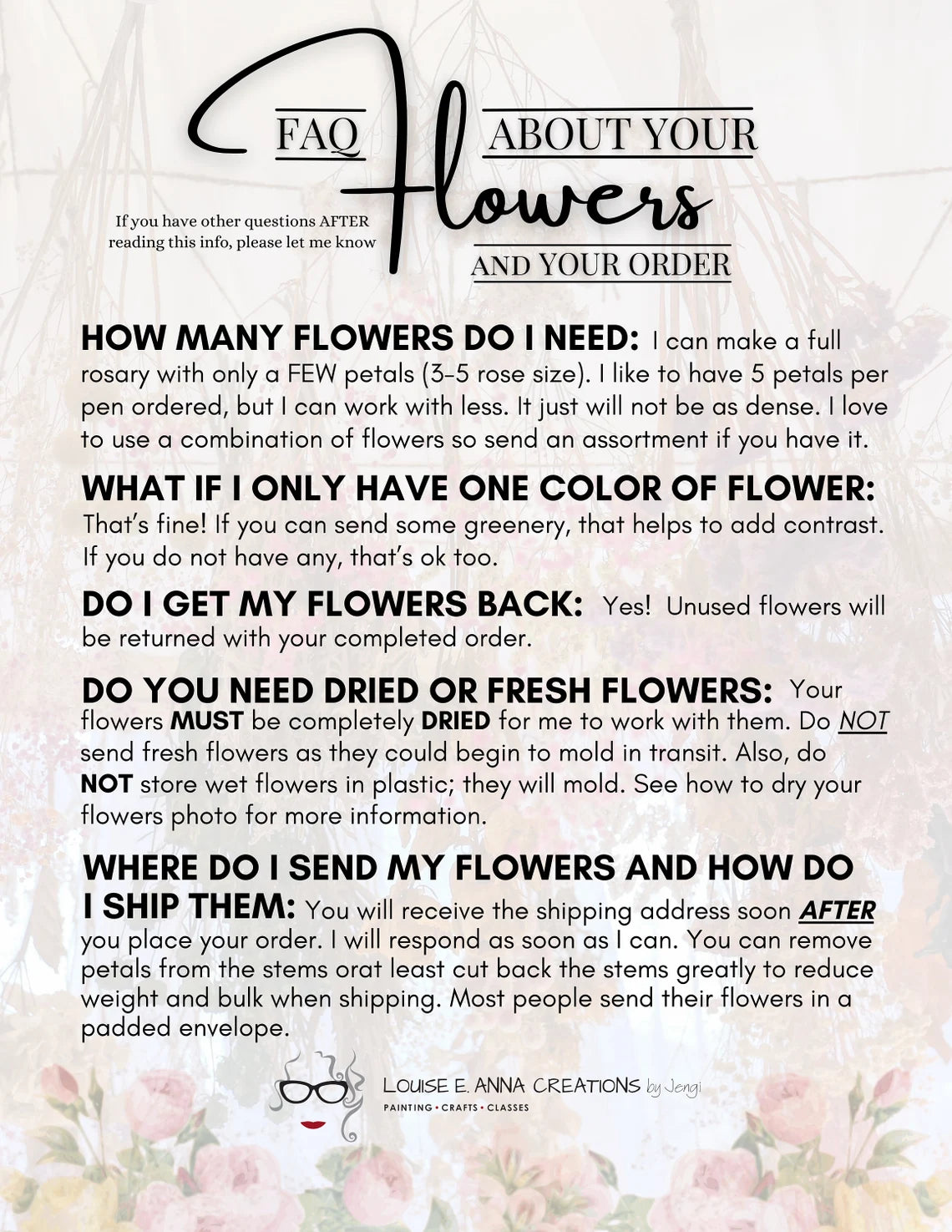 Each of the 53 Hail Mary beads in your rosary is lovingly handmade using a blend of clay and your very own dried flowers. Even just a few petals can create a beautiful, lasting keepsake, and multiple rosaries can be made from a single handful of petals. You can also combine different flowers or greenery to make your rosary uniquely yours—simply send me whatever flowers you would like included.