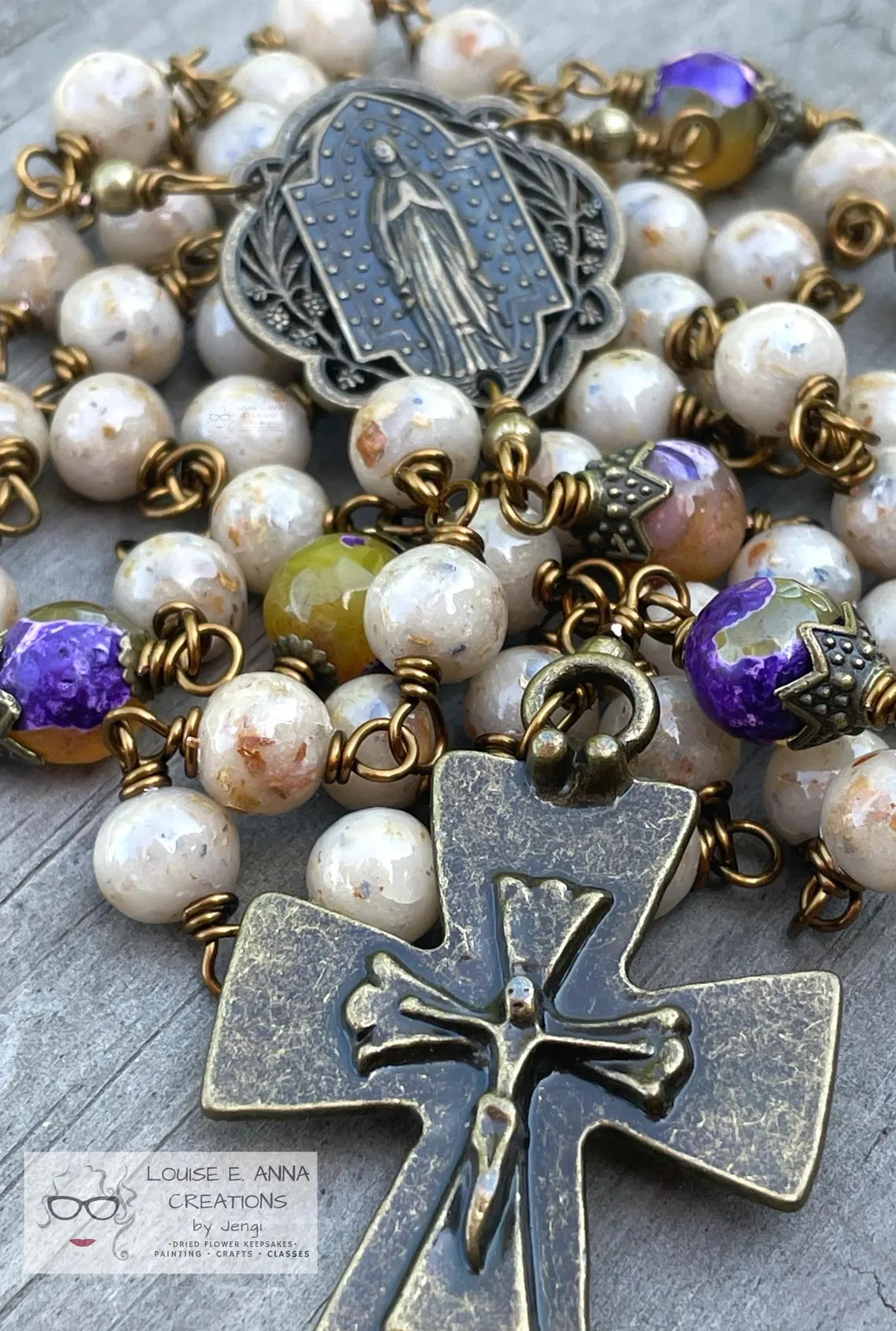 To ensure durability, I use tarnish-resistant wire and wire-wrap every single joint, a time-intensive process that helps prevent breakage. The Our Father beads are typically crafted from semi-precious stones or faceted glass beads. You’ll choose your wire color—gold, silver, or antique bronze—and the color of the Our Father beads. After a brief consultation, I select a center, crucifix, and style of Our Father bead that harmonizes beautifully with your flowers, unless you have something specific in mind.